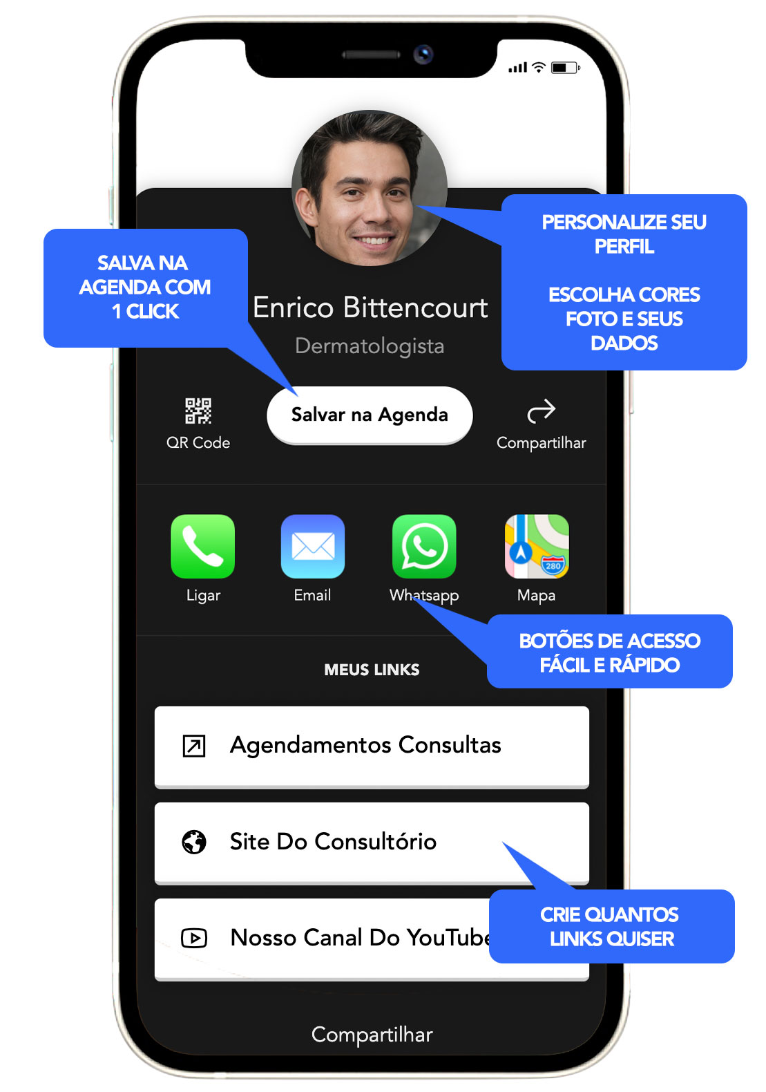 Veja como é fácil fazer com que seu cliente salve seus dados na hora na agenda do celular, ou te envie uma mensagem no whatsapp.
